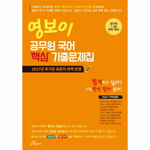책 『영보이 공무원 국어 핵심 기출문제집』은 시험 때마다 시간에 쫓기는 수험생들의 어려움을 확실히 덜어 주기 위해 탄생했다. 수도권 지역에서 당당히 수석과 차석을 거머쥐며 아홉 차례 공무원 시험에 합격한 ‘영보이’만의 ‘이론과 공부법’을 혼용한 수험 비법을 상세히 소개하고 있다. 2017년 새로이 추가된 표준어를 완벽히 반영한 것은 물론, 시험에 반드시 나올 내용들만을 엄선하여 기출문제 중심으로 풀어나간다.