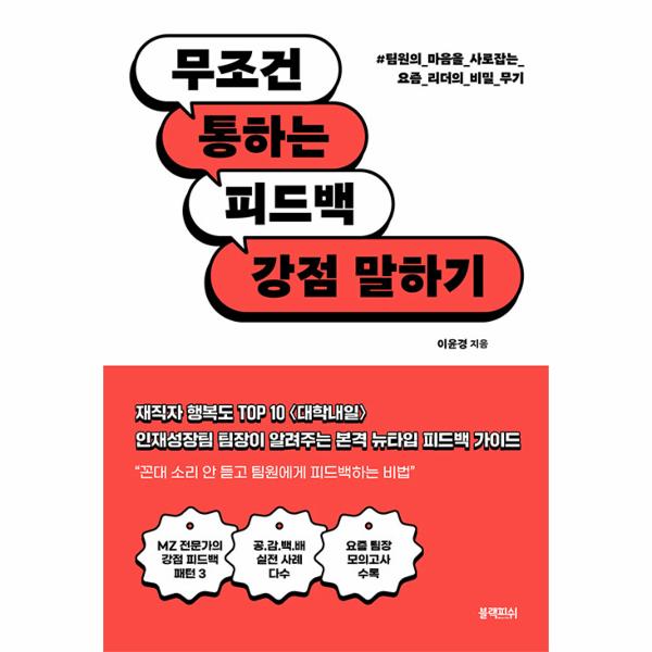 《무조건 통하는 피드백, 강점 말하기》는 그 해답을 ‘피드백’에서 찾았다. 국내 유일 20대 연구 기업, 2년 연속 재직자 행복도 TOP 10에 선정된 <대학내일>의 인재성장팀 팀장인 저자는 이 시대 팀장들에게 새로운 관점의 리더십, 꼭 필요한 팀장의 과업으로 ‘강점 피드백’을 제시한다.