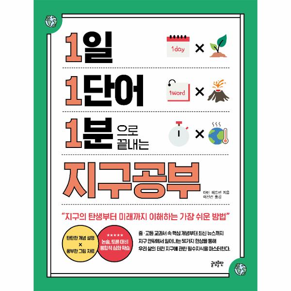 『1일 1단어 1분으로 끝내는 지구공부』는 중고등학교 교과서에 나오는 개본 개념부터 신문, 뉴스 등에 자주 등장하는 지구 안팎에서 벌어지고 있는 50가지 현상을 다양한 시각자료와 함께 설명한다. 그럼으로써 이 각각의 현상들이 지질학적 시간을 거치며 산맥을 세웠다 파괴하고 바다를 만들고 하나였던 대륙을 여럿으로 나눌 수 있다는 사실을 이해하도록 돕는다. 생태와 환경 문제에 그 누구보다 민감한 10대 청소년 독자들은 이 책을 읽고 나면 단편적인 지구과학 지식을 쌓는 수준을 넘어 우리 삶의 터전인 지구가 살아 움직이는 방식 그 자체를 전체적으로 이해하게 될 것이다.