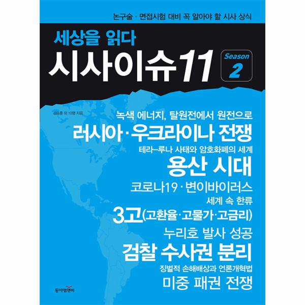 문재인 정부는 무소불위의 검찰 권력을 줄이기 위해 검찰 개혁을 단행했다. 하지만 새로 출범한 윤석열 정부는 시행령 개정을 통해 ‘검수원복’을 추진했다. 전, 현직 정부가 검찰 수사권을 놓고 상반된 주장을 펼치고 있는데, 과연 국민에게는 어떤 영향을 끼칠까? 5년 만의 정권 교체로 윤석열 정부가 출범했다. 청와대를 떠나 용산 국방부 청사로 집무실을 옮겨 시작하는 용산 시대 개막과 청와대 개방은 과연 어떤 의미가 있을까? 환율, 물가, 금리가 ‘악’소리 날 정도로 고공행진 중이다. 한국 경제에 고환율, 고물가, 고금리라는 ‘3고’ 위기가 덮쳤다. 과연 ‘3고’ 현상이 우리 국내 경제에 미치는 영향은 무엇일까? 문재인 정부는 ‘탈원전’ 정책을 통해 재생에너지 확대에 힘을 쏟았다. 하지만 새로 출범한 윤석열 정부는 ‘친원전’ 정책으로 선회했다. 원전은 과연 우리에게 이로울까? 아님 해가 될까? 2월 24일 러시아가 우크라이나를 침공했다. 러시아의 압도적인 공격이 진행되었으나 우크라이나는 7개월이 넘도록 항전 중이다. 러시아와 우크라이나 전쟁이 세계 경제에 미친 영향은 과연 무엇일까? 대만을 둘러싸고 미국과 중국이 맞붙었다. 두 강대국에 대한 의존도가 높은 한국은 이러한 현상에 민감하다. 이 두 나라의 패권 다툼이 국제 사회에 미치는 영향은 과연 무엇일까? 더불어민주당은 2021년 언론사에 징벌적 손해배상을 물리는 내용을 골자로 한 언론개혁법을 추진했다. 언론과 시민단체 등은 ‘언론 옥죄기 법안’이라고 반발했는데, 징벌적 손해배상은 무엇이고 과연 도입