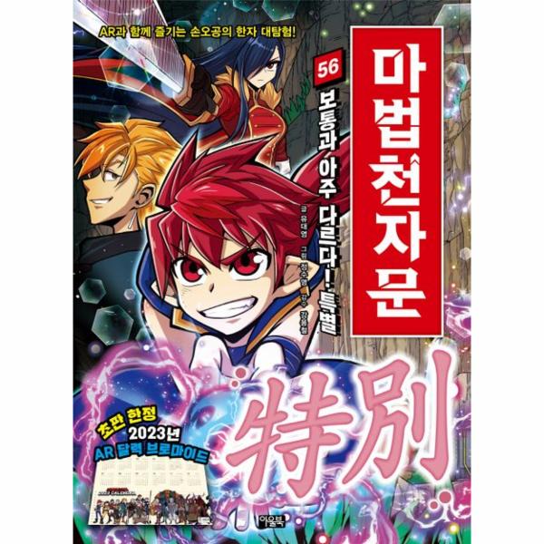 54권부터『마법천자문』은 1~53권을 통해 익혔던 하나하나의 한자들을 ‘어휘력’이라는 한층 고차원적인 방식으로 접근합니다. 우선 국어 학습과 연계하여 초등학생이 꼭 알아야 할 한자 어휘 20개를 선정하고, 유의어와 반의어 등으로 어휘 관계를 확장했습니다. 또한 한자 어휘들을 만화, AR, 학습 섹션, ‘3중 구성을 통해 반복 학습하며 하나의 한자에서 파생되는 여러 어휘들을 완벽하게 자신의 것으로 만들 수 있도록 했습니다. 스토리텔링이 접목된 다양한 퀴즈로 구성한 학습 페이지는 만화의 여운을 이어갑니다. 긴 글을 읽고, 글 속에 담긴 어휘들을 활용해 보며 어휘력은 물론 문해력까지 잡을 수 있습니다.
