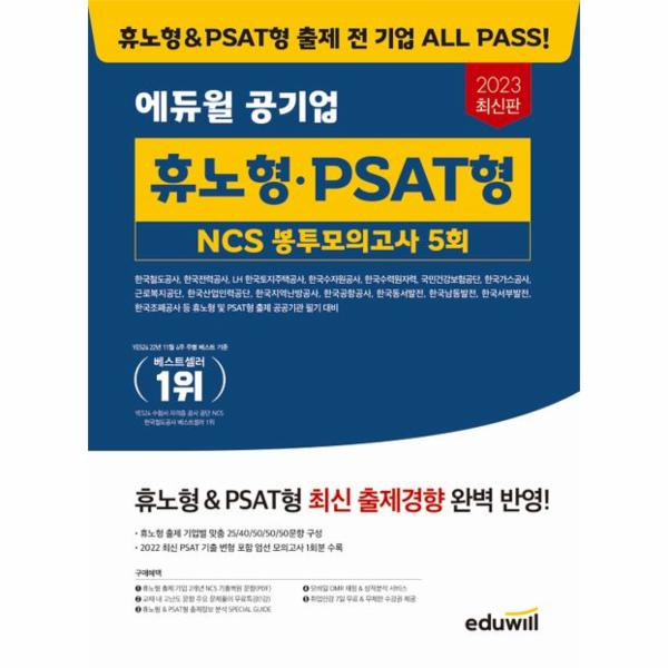 의사소통능력, 수리능력, 문제해결능력, 자원관리능력, 정보능력 5개 영역의 50문항으로 구성하였습니다. 휴노형 출제 주요 기업인 한국전력공사와 휴노형 및 PSAT형 출제 기업을 대비할 수 있도록 하였습니다.