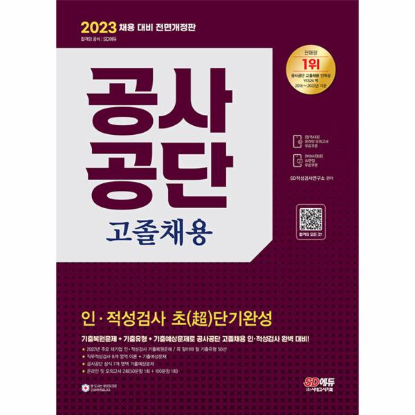 공사공단 고졸채용 필기전형 합격을 위해 (주SD에듀에서는 공사공단 고졸채용을 대비하여 맞춤형 문제로 구성한 『2023 최신판 공사공단 고졸채용 인·적성검사 초(超단기완성』을 출간하였다. 상세한 해설로 혼자서도 학습이 가능하도록 하였으며, 온라인 모의고사를 무료로 응시할 수 있는 쿠폰을 발급하여 공사공단 문제 유형에 대한 연습과 함께 자신의 실력을 최종 점검할 수 있도록 하였다.