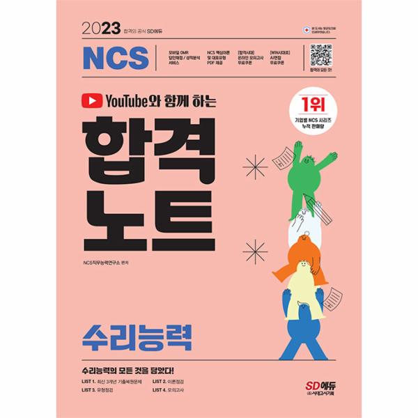 공사·공단 필기시험 합격을 위해 SD에듀에서는 2023년 채용을 대비하여 수리능력 맞춤형 문제로 구성한 『유튜브와 함께 하는 2023 NCS 수리능력 합격노트』를 출간하였다. 상세한 해설로 혼자서도 학습이 가능하도록 하였으며, NCS통합과 핏모의고사를 무료로 응시할 수 있는 온라인 모의고사 쿠폰을 발급하여 수리능력 문제 유형에 대한 연습과 함께 자신의 실력을 최종 점검할 수 있도록 하였다.