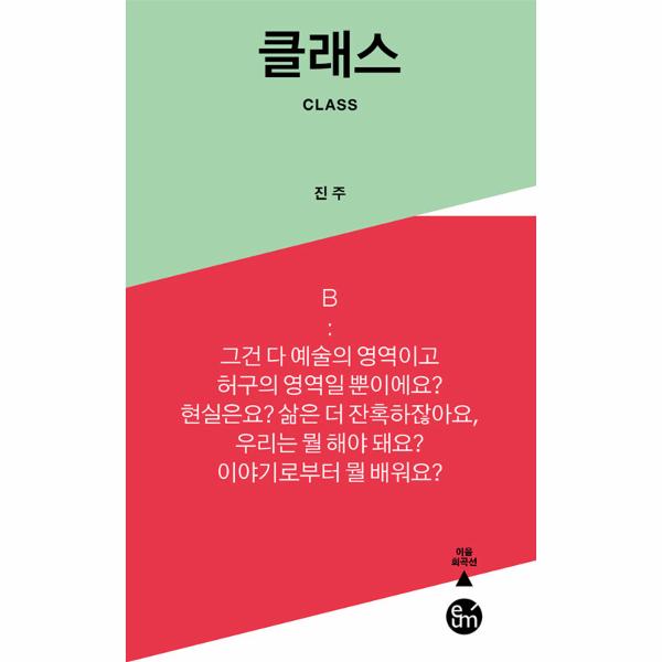이음 희곡선 열여덟 번째 작품 〈클래스〉(CLASS는 한 예술대학의 극작 수업에서 한 학기 동안 중견 극작가인 A와 졸업작품만 남겨둔 학생 B가 졸업작품을 완성해가는 과정을 그린다. ‘두산아트랩’ 공모에 선정되어 2020년에 집필된 대본으로 2021년 낭독을 거쳐 2022년에 초연된 이 작품은 월간 〈한국연극〉의 ‘2022 공연 베스트 7’에 선정되었다. 극작가 진주를 DAC Artist로 선정하여 작품 상연을 지원한 (재두산연강재단 두산아트센터가 희곡집 출간을 지원하였다.