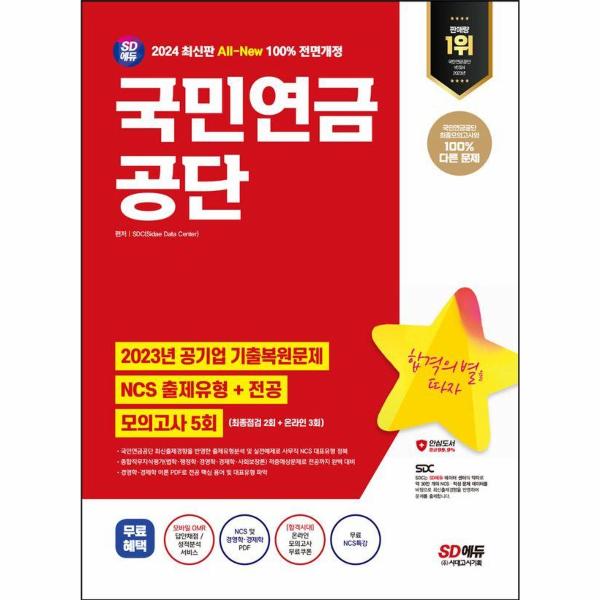 국민연금공단 필기시험 합격을 위해 SD에듀에서는 2024년 채용을 대비하여 국민연금공단 최신 필기시험 맞춤형 문제로 구성한 『2024 최신판 SD에듀 All-New 국민연금공단 NCS+전공+최종점검 모의고사 5회+무료NCS특강』을 출간하였다. 상세한 해설로 혼자서도 학습이 가능하도록 하였으며, NCS 모의고사 1회 + 전공 모의고사 1회 총 2회분의 최종점검 모의고사는 물론, 온라인 모의고사를 무료로 응시할 수 있는 쿠폰을 제공하여 국민연금공단 문제 유형에 대한 연습과 함께 자신의 실력을 점검할 수 있도록 하였다.