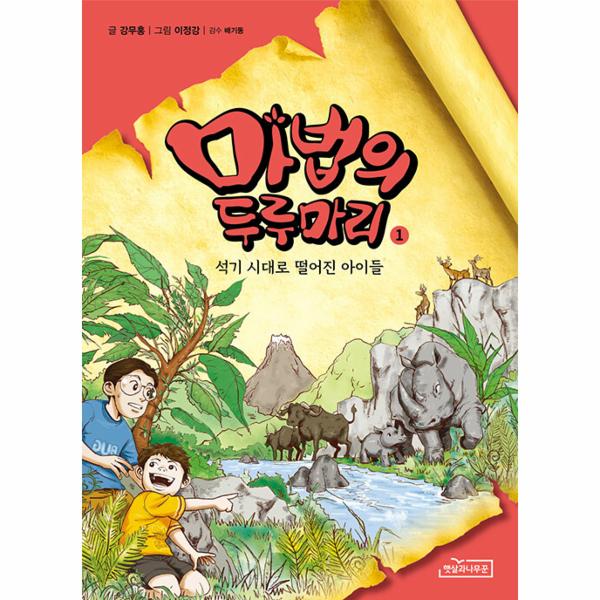시리즈 1권인 『석기 시대로 떨어진 아이들』은 준호와 민호가 마법의 두루마리를 처음 발견하면서 석기 시대로 시간여행을 떠나는 이야기로 시작됩니다. 원시시대의 대자연 속에서 준호와 민호는 사슴 떼도 만나고, 사슴을 사냥하는 털북숭이 원시인도 만나게 되지요. 결국 원시인들에게 끌려가긴 하지만, 재치와 용기를 발휘하여 그곳에서 탈출합니다.