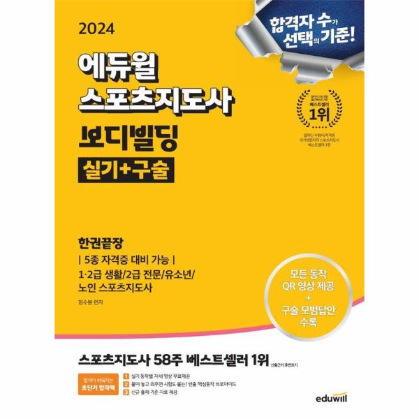 1,2급 생활 스포츠지도사, 유소년 스포츠지도사, 노인 스포츠지도사 시험의 실기 평가 영역뿐만 아니라 2급 전문 스포츠지도사 실기 평가 영역에 포함되어 있는 동작 설명까지 모두 영상으로 제공한다. 베스트셀러 1위 에듀윌 스포츠지도사 시리즈 저자가 친절하게 설명하는 모든 실기 동작별 영상을 QR 코드로 바로 확인할 수 있다. 또한 확대 사진과 NG 사진을 수록하여 시험장에서 실수 없이 동작을 수행할 수 있도록 하였고, 세부 시행 기준, 사용하는 근육, 시험장에서 필요한 TIP을 제공하여 단 한권의 교재만으로도 실기 시험을 완벽하게 대비할 수 있도록 구성하였다.