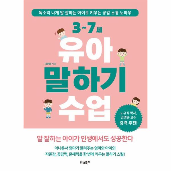 『3~7세 유아 말하기 수업』을 쓴 이운정 원장은 대치와 분당에서 15년간 스피치 학원을 운영하며 1만 2,000여 명의 학생을 지도한 아나운서 출신의 스피치 전문가다. 저자는 이 책에서 소통을 위한 가장 중요한 능력으로 ‘공감 능력과 문해력’을 강조한다. 공감 능력이란 상대방의 말에 기계적으로 반응하는 것이 아니라 그 사람이 말하고 싶은 바를 정확히 꿰뚫고 이에 대해 감정적으로 동조하며 문제 해결까지 함께 고민하는 복잡한 과정이다. 이를 위해서는 부모가 가정에서부터 아이와 많은 대화를 나누며 실질적인 스피치 교육을 해주어야 한다. 이 책에서는 아이의 특성에 따라 성별, 연령별, 성격 유형별 맞춤형 스피치 솔루션을 제시한다.