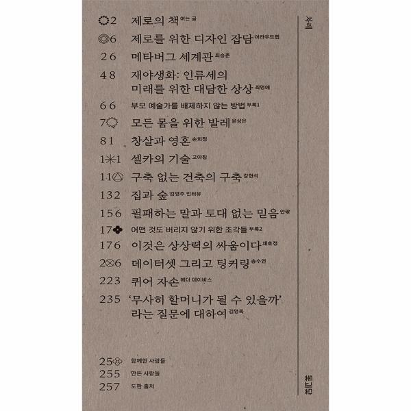 『제로의 책』은 기후위기, 젠더, 인공지능, 지역, 착취와 돌봄 등 우리 시대가 직면한 다양한 이슈를 ‘제로’라는 키워드로 엮은 책입니다. 지구상의 여러 영역에서 벌어지는 과잉 생산과 소비, 우리 내면의 혐오와 차별, 그 앞에서 예술이 갖는 한계와 가능성 등의 문제를 근본적 토대에서부터 돌아보고, ‘제로’ 이후에 새롭게 대면할 내일을 상상합니다.
