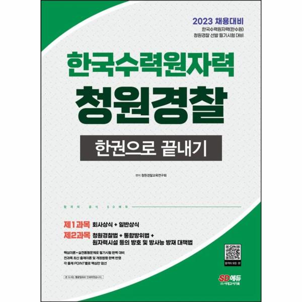 2023 한국수력원자력(한수원 청원경찰 한권으로 끝내기 도서는 한수원 청원경찰 필기시험에 완벽하게 대비할 수 있도록 구성한 도서입니다. 체계적으로 구성한 필기시험 2개 과목(상식, 관련 법령의 내용을 한권에 모두 수록하였으며, 핵심이론+실전동형문제로 구성하여 학습효과를 높였습니다. SD에듀의 청원경찰 시리즈를 통해 합격의 기쁨을 누리시길 바랍니다.