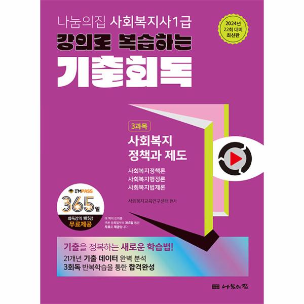 사회복지사1급 전문 출판사, 나눔의집에서는 내용 요약정리, 주요 기출문제 확인하기, 정답 찾는 훈련하기 등을 ‘한번에 잡을 수 있는 방법이 없을까?’라는 고민에서 이 책을 기획하였다. 〈강의로 복습하는 기출회독〉은 효율적이고 효과적인 복습을 위한 교재로 합격의 지름길이 되어줄 것이다.