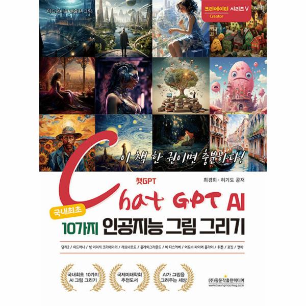 이 책은 요즘 가장 큰 화제가 되는 챗GPT를 활용한 인공지능 그림 그리기 활용서이다. 책에서는 총 10가지의 인공지능 그림 그리기 프로그램을 제공한다. AI 이미지 만들기를 활용하고자 하는 분들은 꼭 이 책을 보시기를 추천한다.