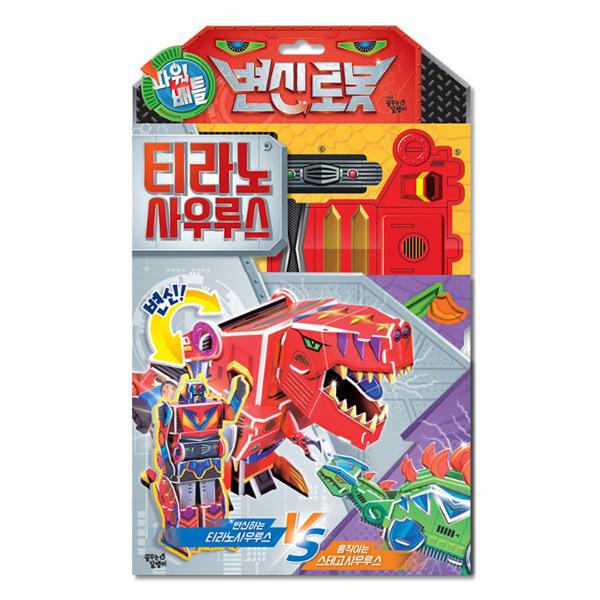 『파워배틀 변신로봇 티라노사우루스』에는 로봇으로 변신하는 티라노사우루스뿐만 아니라 티라노사우루스와 불꽃 튀는 대결을 펼칠 움직이는 스테고사우루스가 들어 있어 흥미진진한 배틀 플레이를 할 수 있습니다. 대결을 펼치는 두 로봇 공룡 외에도 안킬로사우루스, 엘라스모사우루스 등 총 10개의 로봇 공룡을 담고 있어 미래의 우주를 배경으로 상상력과 사회성을 키워 주는 다양한 역할 놀이를 할 수 있습니다. 기존 우드락 만들기 제품에 비해 조립하는 부분이 견고하고 튼튼해 만들고 난 후에도 배경판 앞에 공룡들을 세우고 재미있게 상상의 나래를 펼치며 놀잇감으로 활용할 수 있습니다.