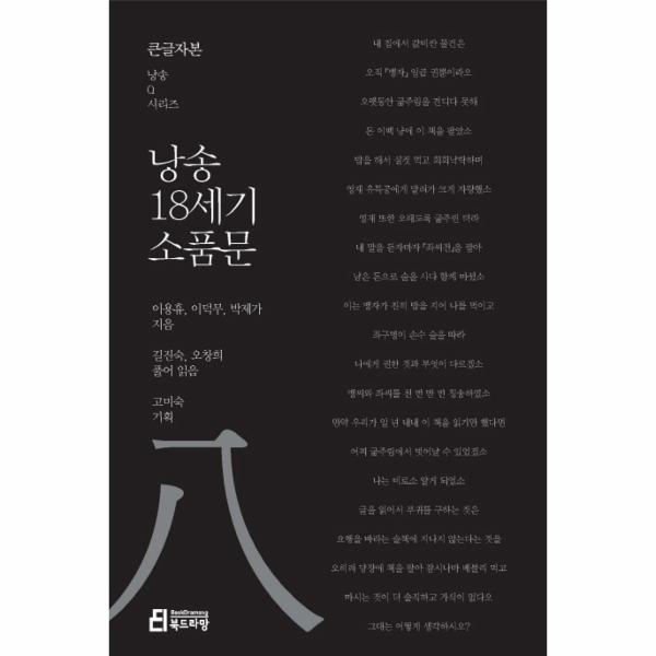 『낭송 18세기 소품문』은 18세기의 뛰어난 문장가인 이용휴, 이덕무, 박제가의 소품체 산문 선집입니다. 이용휴, 이덕무, 박제가는 18세기 조선의 문단에 새로운 바람을 일으킨 장본인들로 당대의 보편적인 글쓰기와는 전혀 다른 글쓰기로 사람들의 주목을 받았습니다. 소품문은 당대의 표준 문체인 ‘고문’(古文의 격식을 깨뜨린 문장으로 참신하고 자유롭게 쓰인 산문을 가리킵니다.
