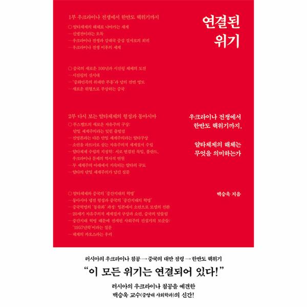 여기, 모든 위기가 연결되어 있다고 말하는 책이 있다. 역사의 재해석을 통해 현재의 위기를 바로 보고, 국제정세 동요기에 한국의 현주소를 살피는 작업을 엄중하고도 찬찬하게 완수해낸 《연결된 위기》다. 다소 멀게만 느껴지는 우크라이나 전쟁이 우리와 마냥 무관한 것이 아니라면? 그뿐 아니라 중국의 대만 점령, 나아가 한반도 핵위기와 연결될 수 있다면? 심지어 한국 사회가 위기의 핵심 장소로 바뀔 수 있다면? 자칫 세계가 2차 세계대전 이전, 1차 세계대전 시대로 되돌아갈 수 있다면? 저자는 여러 물음을 던지며 지금 우리가 발 딛고 선 세계를 매섭게 파헤친다. 국제질서의 변화와 이것이 동아시아에 가져올 충격 그리고 한국 사회에 도래할 수 있는 심각한 군사적 재앙의 가능성을 분석하고 대응하기 위해서는 우리가 익숙하게 알던 역사 전반을 다시금 살펴보아야 한다고 주장한다. 그간 갖고 있던 익숙한 정치적 태도에도 비판을 제기해야 한다고 목소리 높인다. 요컨대 많은 질문을 다시 제기하고, 새로운 답을 모색할 필요가 있다는 것이다.