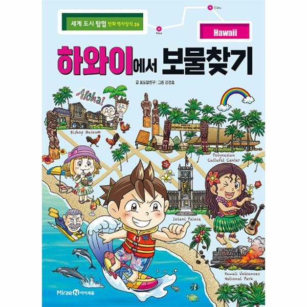 [세계 도시 탐험 만화 역사상식]은 만화 각 장의 뒷부분마다 스토리와 연관이 있는 정보 페이지를 삽입하여, 세계 도시의 역사와 문화에 대한 상식을 효과적으로 전달합니다. 『하와이에서 보물찾기』에는 실제 지도를 바탕으로 하와이의 중요한 명소를 알려 주는 ‘한눈에 보는 랜드마크’, 하와이의 특징을 소개하는 ‘기본 상식 길잡이’ 페이지가 실려 있습니다. 또한 하와이의 역사를 살펴볼 수 있는 ‘역사 상식 살피기’, 하와이에서 즐길 수 있는 먹거리와 여행지를 추천하는 ‘도시 여행 가이드’, 하와이에 있는 보물을 소개하는 ‘도시 속 보물 알기’도 수록되어 있습니다. 여기에 숨은그림찾기가 담긴 ‘재미 팡