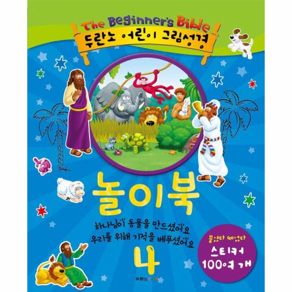 <두란노 어린이 그림성경 놀이북 시리즈>, 성경과 친해지는 시작입니다. 《두란노 어린이 그림성경 놀이북 4》는 크게 두 파트로 구성되어 있어요. 1부에서는 동물 이야기를 통해, 학교에서 진화론을 접하기 전에 아이들 마음에 하나님이 세상을 창조하셨음을 심어 줍니다. 동물을 만드신 하나님, 동물의 이름을 지어 준 아담, 노아가 지은 방주에 둘씩 짝지어 들어간 동물들, 양 떼를 돌보던 목동 다윗, 사자 굴에 던져진 다니엘, 큰 물고기 배 속에 들어갔다 나온 요나, 마구간에서 태어나신 아기 예수님, 예루살렘 성에 나귀를 타고 들어가신 예수님 등 아이들이 좋아할 만한 동물들과 연결된 성경의 핵심 사건들을 소개합니다.
