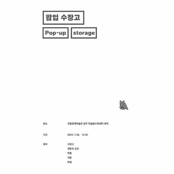 2022년 7월 26일 개방 수장고 앞 로비 공간에 마련된 〈팝업 수장고〉는 관람객이 직접 개방 수장고에 대해 학습할 수 있도록 조성한 공간이다. 특수한 형태의 수장고에 익숙하지 않은 관람객들을 위해 스스로 개방 수장고를 학습해 볼 수 있도록 〈팝업 수장고〉 공간을 조성하고 다양한 콘텐츠를 비치하여 능동적으로 참여할 수 있도록 했다……〈팝업 수장고〉 결과물로 제작된 이 책자는 프로그램이 종료된 이후에도 개방 수장고를 학습하고 이해할 수 있도록 〈팝업 수장고〉의 내용, 결과를 비롯한 다양한 원고를 수록하여 관람객을 위한 안내 가이드로 기능하도록 했다.