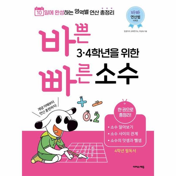 이 책은 3, 4학년 수학의 소수 부분만 한 권으로 모아 집중적으로 훈련하는 책이에요. 문제를 풀기 전 친절한 설명으로 개념을 쉽게 이해하고, 작은 발걸음 방식의 연산 훈련으로 조금씩 어려워지는 문제에 적응하게 도와줍니다. 또한 기초 문장제까지 다뤄 학교 시험 대비까지 할 수 있으니, 딱 10일만 집중해서 초등 소수의 기초를 다져 보세요.