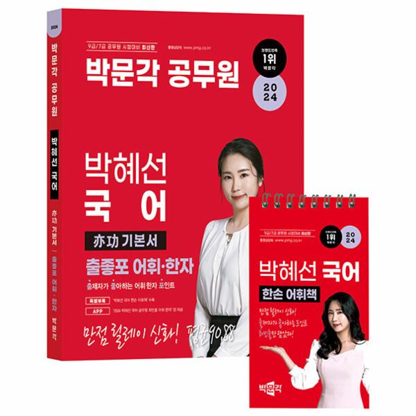 어휘 파트도 반드시 나올 가능성이 있는 적중 단어들로 구성하였다. 부록으로 증정하는 ‘한손 어휘책(수첩’으로 장소에 구애받지 않고 한자와 어문규정을 암기할 수 있어 효율적인 학습이 가능하다. 수험 기간을 줄여주는 콤팩트한 『2024 박혜선 국어 亦功 기본서 출좋포 어휘·한자』와 함께한다면 공무원 단기 합격이라는 꿈을 이룰 수 있을 것이다.
