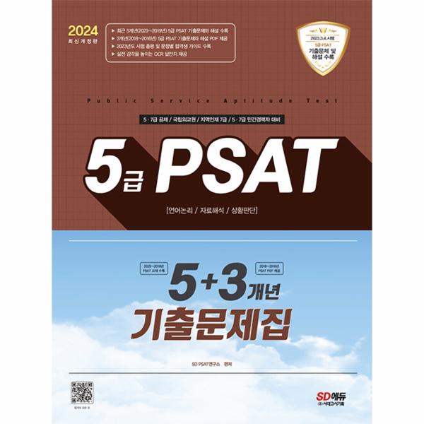 2004년 외무고등고시에 처음 도입된 공직적격성평가(이하 PSAT는 이후 2005년 행정고등고시와 입법고등고시, 그리고 2011년 민간경력자 시험에도 도입되면서 그 중요성이 점차 강조되어 왔습니다. PSAT를 준비하는 수험생을 대상으로 한 설문조사에서, 대부분의 수험생이 PSAT를 대비하기 위한 방법으로 “기출문제”를 선택하고 있다는 조사 결과가 있었습니다. 이는 PSAT 시험이 해를 거듭하면서 어느 정도 고정된 문제 형태를 가지게 된 결과라고 할 수 있습니다. 이에 5급 PSAT 시험을 준비하는 수험생들을 돕고자 『2024 5급 PSAT 5+3개년 기출문제집』을 출간하게 되었습니다. SD에듀의 열정과 신뢰를 담은 도서를 통해 5급 PSAT 시험을 준비하는 수험생 모두에게 합격의 기쁨이 있기를 진심으로 기원합니다.