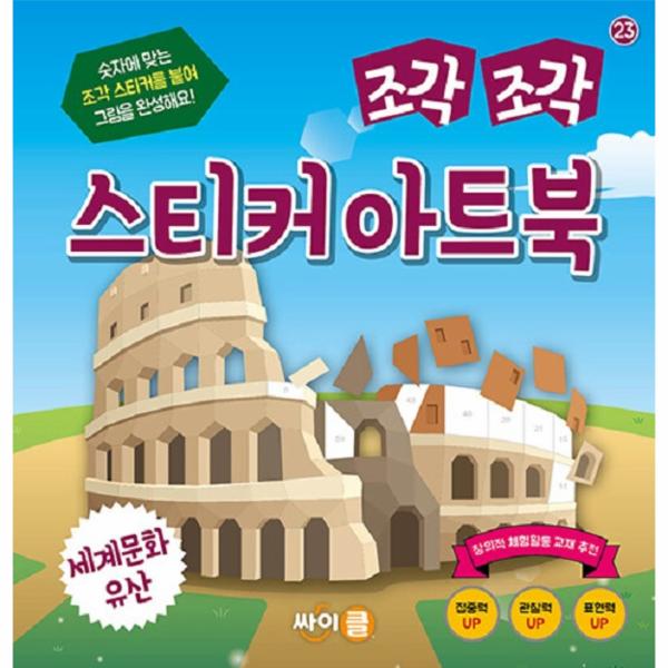 『조각 조각 스티커 아트북』은 스티커를 붙여 그림을 완성할 수 있는 숫자 도안이 담긴 바탕지 8장과 바탕지 숫자에 맞는 알록달록 조각 스티커 10장으로 구성되어 있어요. 『조각 조각 스티커 아트북』 시리즈 「우리문화유산」 편에서는 강화 고인돌, 성산일출봉, 첨성대, 오죽헌, 하회탈, 숭례문, 거북선, 화성 등 총 8개의 우리문화유산을 완성할 수 있어요. 조각 스티커의 개수는 41개부터 83개까지 작품마다 다양하게 구성되어 있어서 붙이기 쉬운 그림부터 완성도 높은 그림까지 체험해볼 수 있어요.
