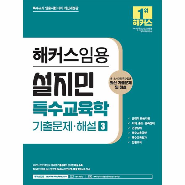 〈해커스임용 설지민 특수교육학 기출문제 해설 3〉은 특수교육학 실전연습에 필요한 2009~2023학년도 기출문제와 답안을 수록한 교재로, 특수교육학 기출문제를 풀이한 후 답안과 상세한 해설로 부족한 이론을 학습할 수 있습니다.
