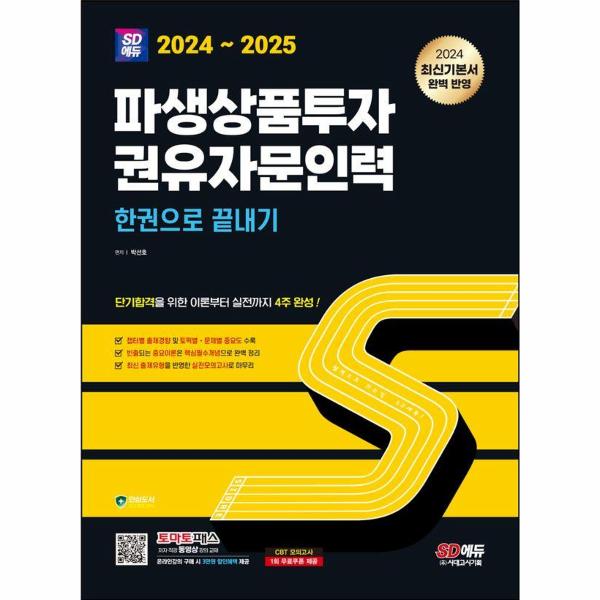 『2024~2025 파생상품투자권유자문인력 한권으로 끝내기』는 파생상품투자권유자문인력 자격시험 대비를 위한 최종정리서로, <토마토패스 동영상강의(저자직강>를 통해 학습이 가능합니다.