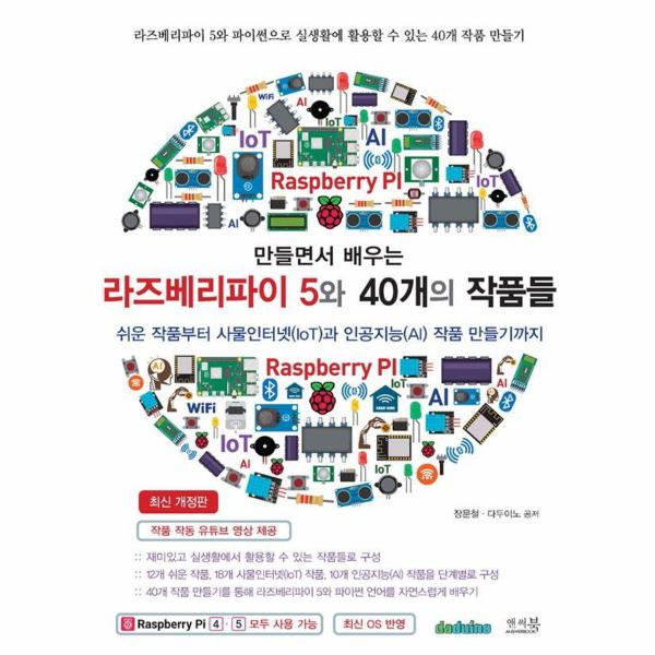 <만들면서 배우는 라즈베리파이 5와 40개의 작품들>은 최신 OS를 기반으로 라즈베리파이 5로 작품과 내용을 대폭 보강해서 최신 개정판으로 출간되었다. 책은 12개의 쉬운 작품, 18개의 사물인터넷(IoT 작품, 10개의 인공지능(AI 작품을 단계별로 만들어볼 수 있도록 구성하였다.