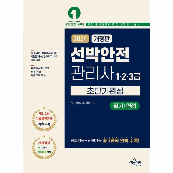 현직 해사행정사 저자의 노하우와 지식을 총동원하여 집필한 ‘2024 선박안전관리사(1·2·3급 초단기완성[필기+면접]’ 도서가 출간되었습니다. 본 도서는 가장 최신의 법령을 완벽 반영함은 물론, 누구나 빠르게 합격하기 위해 과목별 ‘핵심이론+예상문제+기출복원문제+실전모의고사+면접 족보’로 구성하였습니다. 또한 네이버 카페 ‘한끝선’에서 저자 직강 동영상 강의 교재로 활용하고 있어 확실한 학습이 가능합니다.