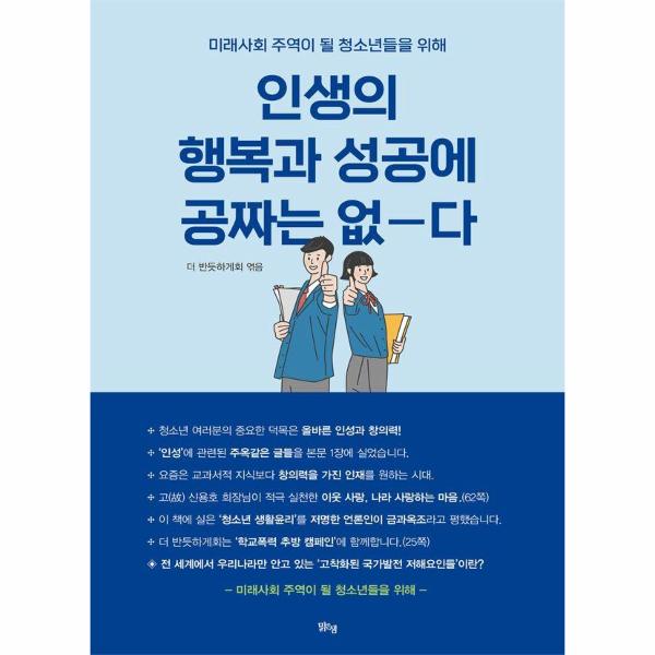 “청소년기는 인성을 형성하는 데 매우 중요한 시기다” “올바른 인성을 형성하기 위해 서는 좋은 책을 많이 읽는 것이 좋다”라는 말이 있습니다. 이 장 ‘훌륭한 인성, 선행과 미담’의 다양한 실제 사례와 ‘청소년 생활윤리’를 주의 깊게 읽어보기를 권합니다.