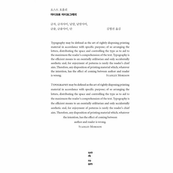 이 책 『마이크로 타이포그래피』는 제목에서 드러나듯 타이포그래피의 세밀한 영역을 다룬다. 글자와 글자 사이, 낱말과 낱말 사이, 글줄과 글줄 사이 등, 하나의 글이 최선의 가독성과 판독성을 갖추기 위해 세부 영역에서 지켜야 할(혹은 염두에 둬야 할 사항에 초점을 맞춘다. 그만큼 이 책에서 다루는 요소들은, 설사 이와 밀접한 관계를 맺고 있는 전문가라 할지라도 간과하기 쉬운 부분이다. 기본에 해당하는 요소일뿐더러 “흔히 ‘창조적’이라 여겨지는 영역 밖에” 있기 때문이다. 물론 글자와 글자 사이 공간에서 창조적인 무언가를 만들어내기란 여간 어려운 것이 아니다. “이번에 네가 조판한 글자사이 공간은 정말 창조적이야”라는 반응을, 반어법이 아니고서야 우리는 기대하기 어렵다. 저자인 요스트 호훌리도 굳이 이것이 창조적일 필요는 없다고 말한다.