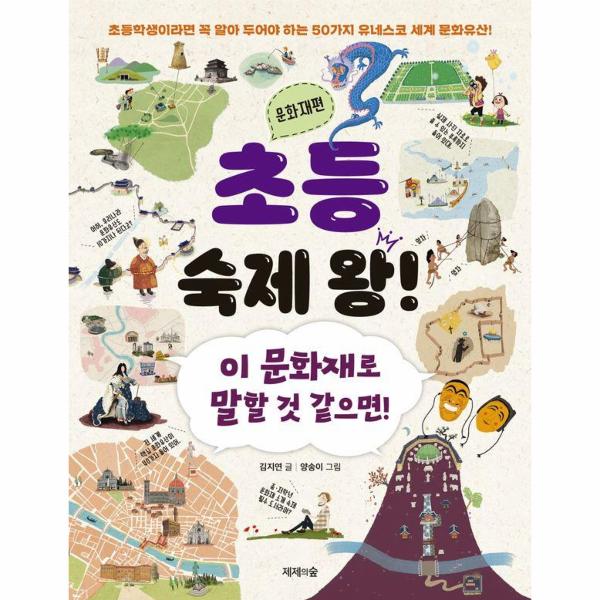 《초등 숙제 왕! 문화재편 - 이 문화재로 말할 것 같으면!》에는 교과서에 나오는 전 세계 문화재 가운데 50가지를 나라별, 목적별, 시대별로 골고루 뽑아 소개한다. 문화재의 특징과 핵심 정보를 간략하면서도 이해하기 쉬운 글로 써 놓았고, 문화재 조사 숙제에 꼭 필요한 정보를 잘 정리하고 있어 숙제를 할 때나 문화유산 수업 시간에 딱 맞는 필수 도서다.