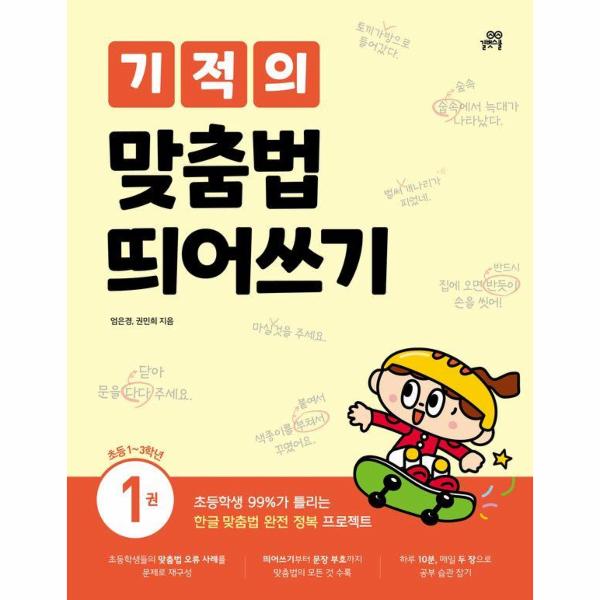 〈기적의 맞춤법 띄어쓰기〉는 초등학생들의 맞춤법 오류 사례를 모아 분석하였습니다. 사례를 모아 보니 학생들이 가장 많이 틀리는 맞춤법 1위는 소리가 비슷한 ‘ㅐ’와 ‘ㅔ’였습니다. 2위는 ‘ 때문에’를 ‘때무네’로 쓰는 것처럼 받침이 뒤로 넘어가서 소리 나는 것에 해당하는 맞춤법입니다. 3위는 받침의 발음입니다. 이렇게 초등학생들이 틀리는 맞춤법은 대부분 소리 나는 대로 적는 데에서 오는 실수가 대부분이었습니다. 한글은 소리 나는 대로 적는 글자이기는 하지만, 소리 나는 대로만 적어서는 안 됩니다. 그래서 〈기적의 맞춤법 띄어쓰기〉는 낱말의 소리와 모양의 관계를 먼저 생각해 보는 것에서 출발합니다. 무조건 외우기보다는 소리와 모양의 연관 관계를 바탕으로 원리를 이해할 수 있도록 구성하였습니다. 이런 분석을 바탕으로 아이들에게 친숙하면서 생동감 있는 문제로 재구성하였습니다. 학생들이 평소에 접할 수 있는 받아쓰기, 전래동화, 일기, 만화 등의 장르로 쉽고 재미있게 맞춤법을 배우고 익힐 수 있습니다.