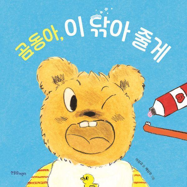 곰동이가 냠냠 맛있게 간식을 먹었어요. 곰동이 이를 깨끗이 닦아 주어야겠어요. 어서 곰동이를 목욕탕으로 데리고 가요. 먼저 턱받이를 둘러 주고, 칫솔에 치약을 조금만 짜요. 그리고 곰동이 이에 칫솔을 문질러요. 왼쪽으로 치카치카. 오른쪽으로 치카치카. 윗니도 아랫니도 치카치카 푸카푸카. 치약 거품은 물로 깨끗이 헹궈 줘야겠죠? 가르르르 가르르르. 짠! 곰동이 이를 다 닦았어요. 아, 그런데 곰동이 입가가 푹 젖었네요. 입가에 묻은 물기를 수건으로 톡톡 닦아 주면, 진짜 끝! 곰동이 이를 다 닦았어요. 반짝반짝 예쁜 이가 되었네요. 곰동이한테 쪽, 뽀뽀해 줄까요?