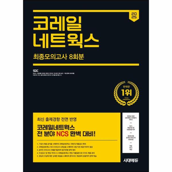 이에 시대에듀에서는 코레일네트웍스 판매량 1위의 출간 경험을 토대로 『2025 최신판 시대에듀 코레일네트웍스 NCS 최종모의고사 8회분+인성검사+면접+무료NCS특강』을 출간하였다. 최신 출제 경향 맞춤 NCS 모의고사를 6회분 수록하고 온라인 모의고사 2회분을 제공하여 자신의 실력을 점검하고 향상시킬 수 있도록 하였다. 또한, 정답과 오답에 대한 상세한 해설을 통해 혼자서도 학습이 가능하도록 하였으며, 코레일네트웍스 인성검사 및 면접 가이드를 통하여 다각도로 채용을 대비할 수 있도록 하였다.