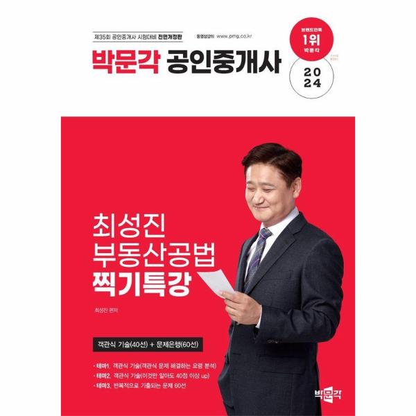 [2024 박문각 공인중개사 최성진 부동산공법 찍기특강]은 2024년 제35회 공인중개사 자격시험을 대비하여 객관식 기술과 반복되는 문제 60선을 엄선한 교재입니다.