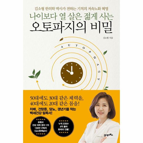 《나이보다 열 살은 젊게 사는 오토파지의 비밀》은 김소형 한의학 박사의 방대한 백세비법 아카이브에서 최소한의 건강 지식들만 주제별로 엄선한 건강교양서로, 치매와 갱년기부터 암과 당뇨에 이르기까지, 질병과 노화를 한 번에 잡는 최강 장수 비법을 담았다. 늙지 않는 비결 오토파지, 젊음을 되찾는 운동과 식단의 법칙, 독이 되는 습관과 득이 되는 습관을 알아봄으로써 나이보다 최소 열 살은 젊게 살 수 있는 놀라운 변화를 경험해 볼 수 있을 것이다.