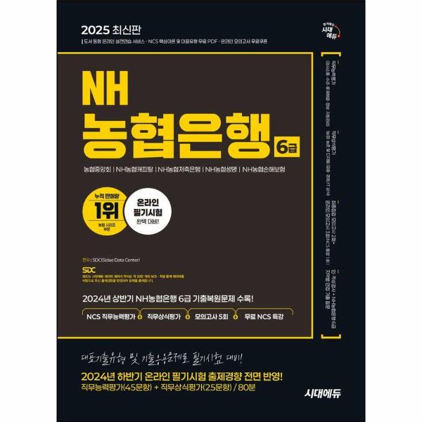 NH농협은행 6급 신규직원 채용 필기시험은 2023년부터 온라인으로 진행되고 있다. 이에 시대에듀는 NH농협은행 6급 온라인 필기시험을 준비하는 수험생들이 시험에 효과적으로 대비하도록 『2025 최신판 시대에듀 NH농협은행 6급 NCS 직무능력평가+직무상식평가+모의고사 5회+무료NCS특강』을 출간하게 되었다.