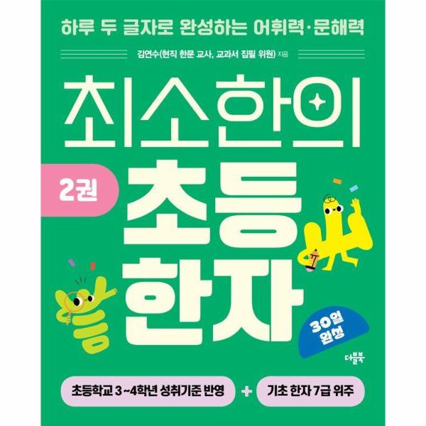 ≪최소한의 초등 한자≫ 1권에서 획순이 적고 쉽게 이미지를 떠올릴 수 있는 한자로 한자에 대한 이해와 흥미를 올렸다면, 2권은 ‘우리’라는 주제를 가져와 주변에 관심을 갖도록 한자를 뽑았다. 동네, 자연, 언어, 생활 등 일상에서 겪는 일과 보는 사물을 중심으로 한자에 대한 흥미를 이어나간다. 또 배운 한자와 연관된 속담을 매일 하나씩 읽고 생각을 넓힐 수 있는 코너도 있다. 한자를 공부하며 평소 사용하는 말의 뜻을 다시 정확하게 새기고, 더욱 풍부한 언어생활을 할 수 있을 것이다. 2권은 3~4학년 교과 성취기준을 반영한 지문을 수록하여 교과 학습의 기반을 다질 수 있도록 하였다.