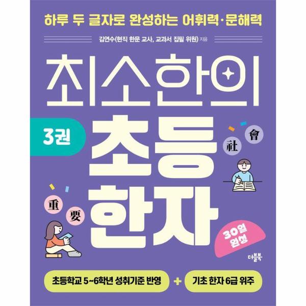 ≪최소한의 초등 한자≫ 3권에서는 교과 개념어에 집중한다. 국어, 사회, 역사, 수학, 과학, 체육·예술, 전 과목의 개념어를 담았다. 나아가 중학 교과를 대비할 수 있는 ‘미리 만나는 중학교 교과서 한자 어휘’ 코너까지 살뜰하게 담았다. 5~6학년 성취기준을 반영한 지문과 배운 어휘를 활용하여 직접 문장을 써보는 활동이 있어 문해력과 작문 실력을 동시에 키울 수 있다. 각 단원별로 한자 성어의 유래를 재미있게 풀어두어 한 번 읽으면 그 뜻이 머리에 콕 박힐 것이다. 어휘가 어려워서 공부가 어려운 학생이라면 꼭 봐야 할 필수 학습서이다.