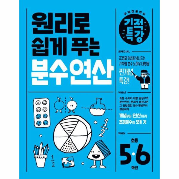 기적특강 『원리로 쉽게 이해하는 분수 개념』과 『원리로 쉽게 푸는 분수 연산』은 초등 3~6학년까지 단원별로 따로따로 배우던 분수를 한군데 모아, 계통과 맥락을 이해하며 공부하는 초등분수 완결판입니다.