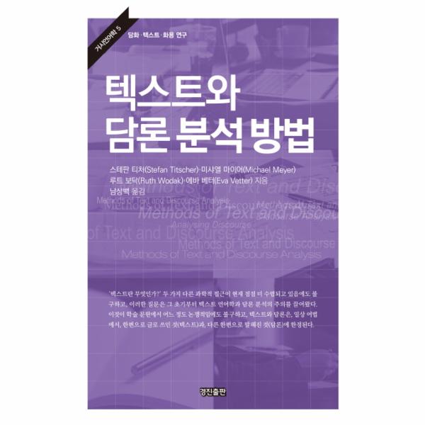 [텍스트와 담론 분석 방법](도서출판 경진, 2015은 스테판 티처(Stefan Titscher, 미샤엘 마이어(Michael Meyer, 루트 보닥(Ruth Wodak, 에바 베터(Eva Vetter의 독일어판 Methoden der Textanalyse: Leitfaden und ?berblick(Opladen/Wiesbaden: Westdeutscher Verlag, 1998의 영역본 Methods of Text and Discourse Ana...