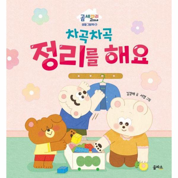 <곰 세 마리 고미네> 생활 그림책 시리즈의 여덟 번째 권 《차곡차곡 정리를 해요》는 아기 곰 고미가 아빠 곰, 엄마 곰과 함께 물건을 제자리에 정리하는 모습을 보여 줍니다. 꽃밭에 물을 주고 나서는 물조리개를 선반 위 제 위치에 올려 두고, 집으로 들어와서는 신발을 탁탁 털어 신발장에 넣어 둡니다. 아빠 곰과 함께 양말을 정리해서 서랍장에 차곡차곡 보관하고, 엄마 곰이랑 블록 놀이를 하고 책도 읽지요. 바닥에 널브러져 있던 블록과 책들까지, 제자리에 정리하는 고미의 모습을 하루의 일상을 통해 자연스럽게 보여 줍니다.