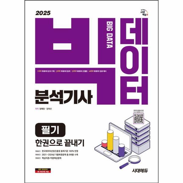 최근 4차 산업혁명 시대의 도래로 산업뿐만 아니라 경제·사회·문화 등 모든 영역에 인공지능 제품과 서비스가 보편화되면서 인공지능 알고리즘을 개발하기 위해 필요한 빅데이터 분석 직무능력의 중요성이 강조됨에 따라 빅데이터분석기사의 관심도가 점점 높아지고 있습니다. 따라서 시대에듀는 빅데이터분석기사를 준비하는 수험생들에게 보탬이 되기 위해 국가직무능력표준과 교육과정을 반영한 도서를 출간하게 되었습니다.