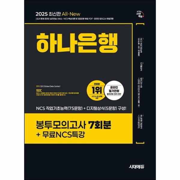 하나은행은 인재를 채용하기 위해 필기전형을 시행하여 업무에 필요한 역량을 갖추고 있는지 평가한다. 이를 위한 하나은행 필기전형은 2024년 하반기부터 온라인으로 진행되고 있다. 이에 시대에듀에서는 하나은행 온라인 필기전형을 준비하는 수험생들에게 좋은 길잡이가 되어 주고자 『2025 최신판 시대에듀 All-New 하나은행 온라인 필기전형 봉투모의고사 7회분+무료NCS특강』을 출간하게 되었다.