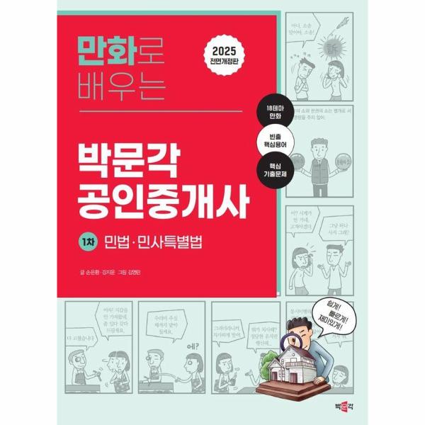 <2025 만화로 배우는 박문각 공인중개사 1차 민법·민사특별법>은 처음 공인중개사 시험을 준비하거나 기초부터 탄탄하게 다지고자 하는 수험생에게 적합한 교재이다. 본서는 기본 이론을 생동감 있는 만화로 제시하여 수험생이 쉽고 재미있게 민법 이론을 익힐 수 있도록 구성되어 있다. 더 나아가 최근 개정 법령과 최신 기출문제를 수록하여 새로운 출제경향을 빠르게 파악하고 실전 감각을 기를 수 있도록 하였다. 또한, 민법 용어에 대한 수험생들의 이해를 돕고자 ‘빈출 핵심용어’를 제시하였다. 재미는 물론 내용의 질까지 놓치지 않은 <2025 만화로 배우는 박문각 공인중개사 1차 민법·민사특별법>은 만화로 생생하고 재미있게 설명해 주는 책인 동시에 학습에도 분명하게 도움이 되는 책이다. 본서를 통해 공인중개사 시험에서 자신감과 실력을 기를 수 있기를 바란다.