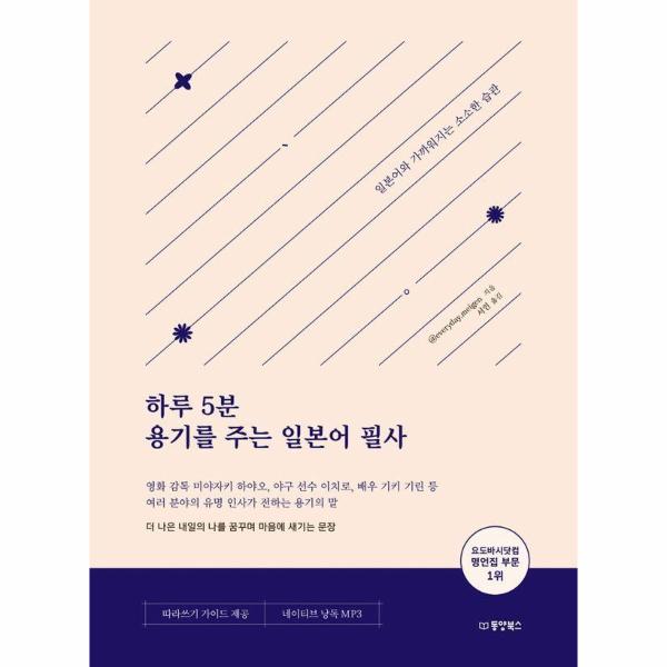 『하루 5분 용기를 주는 일본어 필사』는 영화감독 미야자키 하야오, 야구 선수 이치로, 배우 기키 기린 등 유명 인사들의 명언을 필사하며 일본어 실력을 향상시키는 동시에, 삶에 대한 위로와 용기를 얻을 수 있는 책입니다.