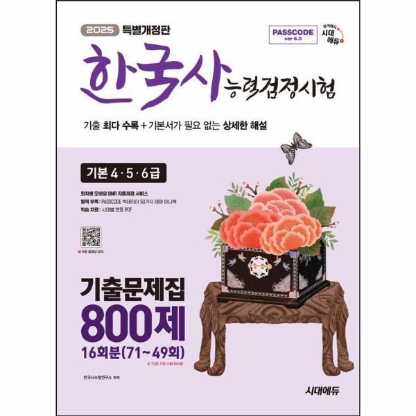 ㈜시대고시기획에서 출간한 ‘PASSCODE 한국사능력검정시험 기출문제집’! 한국사수험연구소에서는 기본서가 필요 없는 상세한 해설로 혼자서 공부해도 틀린 문제를 완벽하게 이해할 수 있도록 구성하였습니다. 기본서가 필요 없는 상세한 해설과 PASSCODE 빅데이터 50가지 테마 미니북, 한능검 시대별 연표를 통해 4급 합격에 다가가 보세요!
